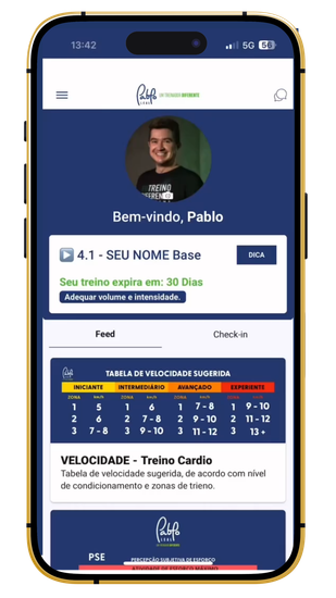 Em até 48h, você terá um treino personalizado com séries, métodos e videos dos exercícios no app.